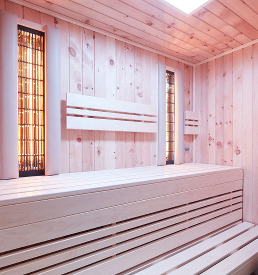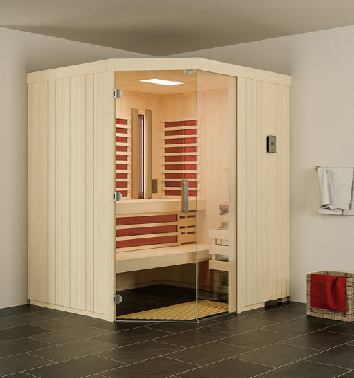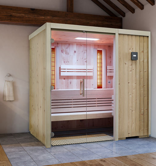 Die Sauna Optima mit zwei VITALlight-ABC-Infrarotstrahlern, Verdampferofen mit Sole-Therme und Steuerung sorgt für die optimale Verbindung aus Schwitzen und Entspannung. Für das vollkommene Erlebnis kann sie auch noch mit einer Infrarot-Flächenheizung kombiniert werden.